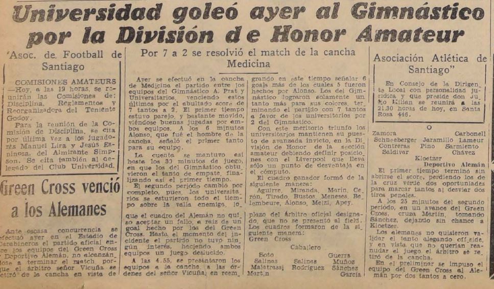 4/11/1934 | Escuela de Medicina | Gimnástico Arturo Prat | 7x2 | Alonso(5), n/d | [7] |