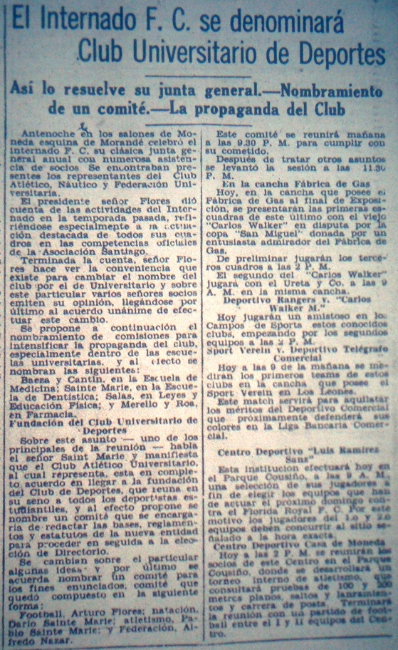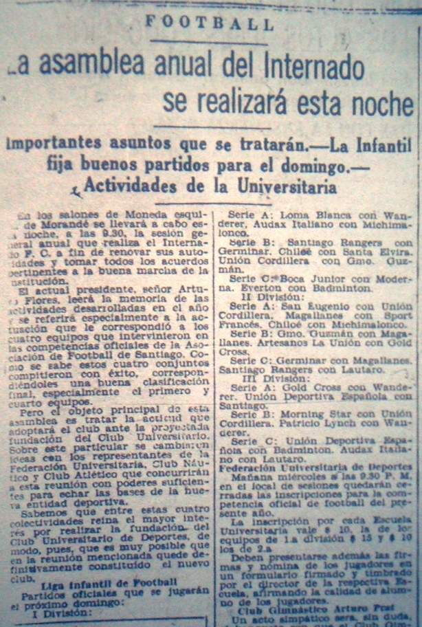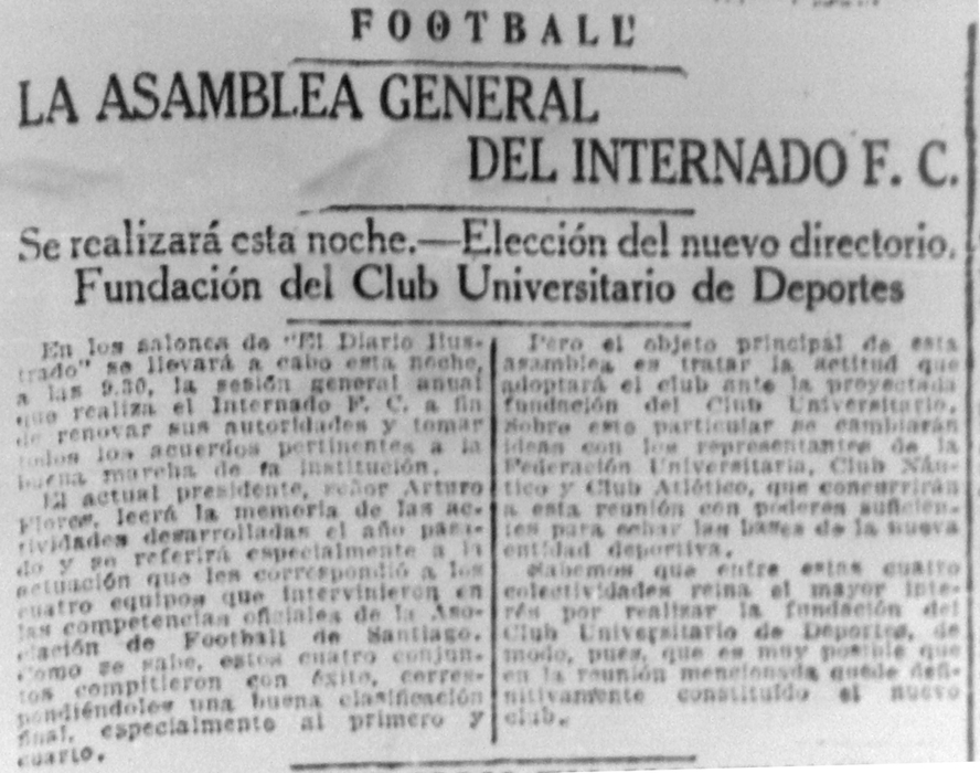 El día de 24 de mayo de 1927 se realizó la asamblea anual del Internado FC, el propósito principal de esta asamblea era efectivamente la creación de una nueva institución, tal como que da claro de la lectura de los siguientes notas publicadas el mismo día en El Mercurio y el Diario Ilustrado. Como curiosidad vale mencionar que ambas son casi idénticas, lo que hace suponer que corresponden a una simple transcripción de un texto redactado por la misma mano, seguramente por alguno de los organizadores que dejó una carta en las redacciones de los medios. La principal diferencia entre ambas es que en la de El Mercurio se omite mencionar que la asamblea se llevaría a efecto en los salones del Diario Ilustrado.