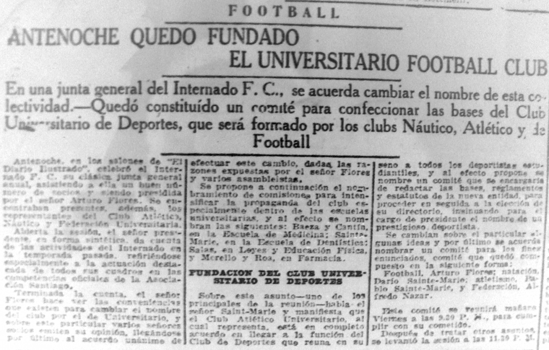 Con el propósito de aclarar o al menos aportar el debatido tema de la verdadera fecha de fundación de la U, he rescatado un conjunto de recortes de prensa que establecen el curso de los acontecimientos que condujeron a la creación del Club Universitario de Deportes, denominación original del luego Club Deportivo de la Universidad de Chile, hoy en día Club de Futbol Profesional de la Universidad de Chile (y no Azul Azul como creen algunos, que es solamente la concesionaria).