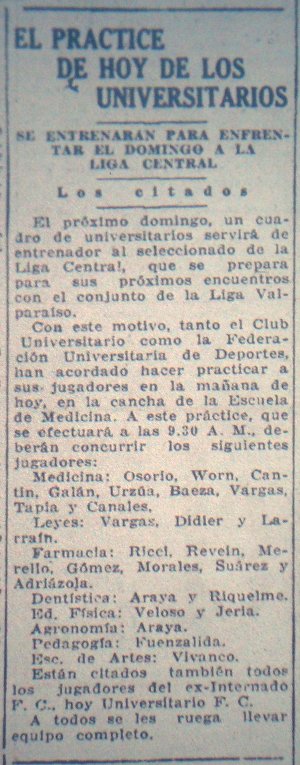 El Mercurio en la misma página de la nota relativa a la asamblea publica otra nota relacionada a una práctica de futbol de "los universitarios" que se preparaban a jugar un amistoso con la selección de la Liga Central, en la práctica una especie de selección nacional. Lo trascendente de este artículo es que se cita a entrenar a los "estudiantes" de diferentes facultades junto a los del Internado FC, con lo que queda mas que establecido que esta fusión representó efectivamente la integración de los elementos propiamente estudiantiles a los del IFC en la disputa de los diferentes "lances" futbolísticos. Es decir, no se trató de un mero cambio de nombre, como confusamente señalan las propias publicaciones de la época, sino que de la unión de diferentes instituciones y conjuntos de personas en una nueva organización.